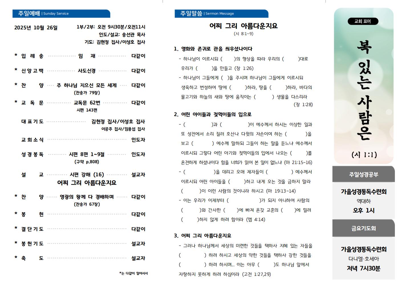 2025년 10월 26일 주일예배 admin2025-10-25T12:37:49+09:00공유해주세요!FacebookTwitterGoogle+ Related Posts 2025년 10월 19일 주일예배 2025년 10월 19일 주일예배 2025-10-18 | 0 Comments 2025년 10월 12일 주일예배 2025년 10월 12일 주일예배 2025-10-11 | 0 Comments 2025년 10월 5일 주일예배 2025년 10월 5일 주일예배 2025-10-04 | 0 Comments 2025년 9월 28일 주일예배 2025년 9월 28일 주일예배 2025-09-27 | 0 Comments 2025년 9월 21일 주일예배 2025년 9월 21일 주일예배 2025-09-20 | 0 Comments