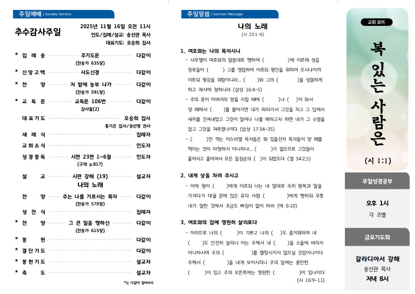 2025년 11월 16일 추수감사주일 admin2025-11-15T17:15:15+09:00공유해주세요!FacebookTwitterGoogle+ Related Posts 2025년 12월 14일 주일예배 2025년 12월 14일 주일예배 2025-12-13 | 0 Comments 2025년 12월 7일 주일예배 2025년 12월 7일 주일예배 2025-12-13 | 0 Comments 2025년 11월 23일 주일예배 2025년 11월 23일 주일예배 2025-11-22 | 0 Comments 2025년 11월 9일 주일예배 2025년 11월 9일 주일예배 2025-11-08 | 0 Comments 2025년 11월 2일 주일예배 2025년 11월 2일 주일예배 2025-11-08 | 0 Comments
