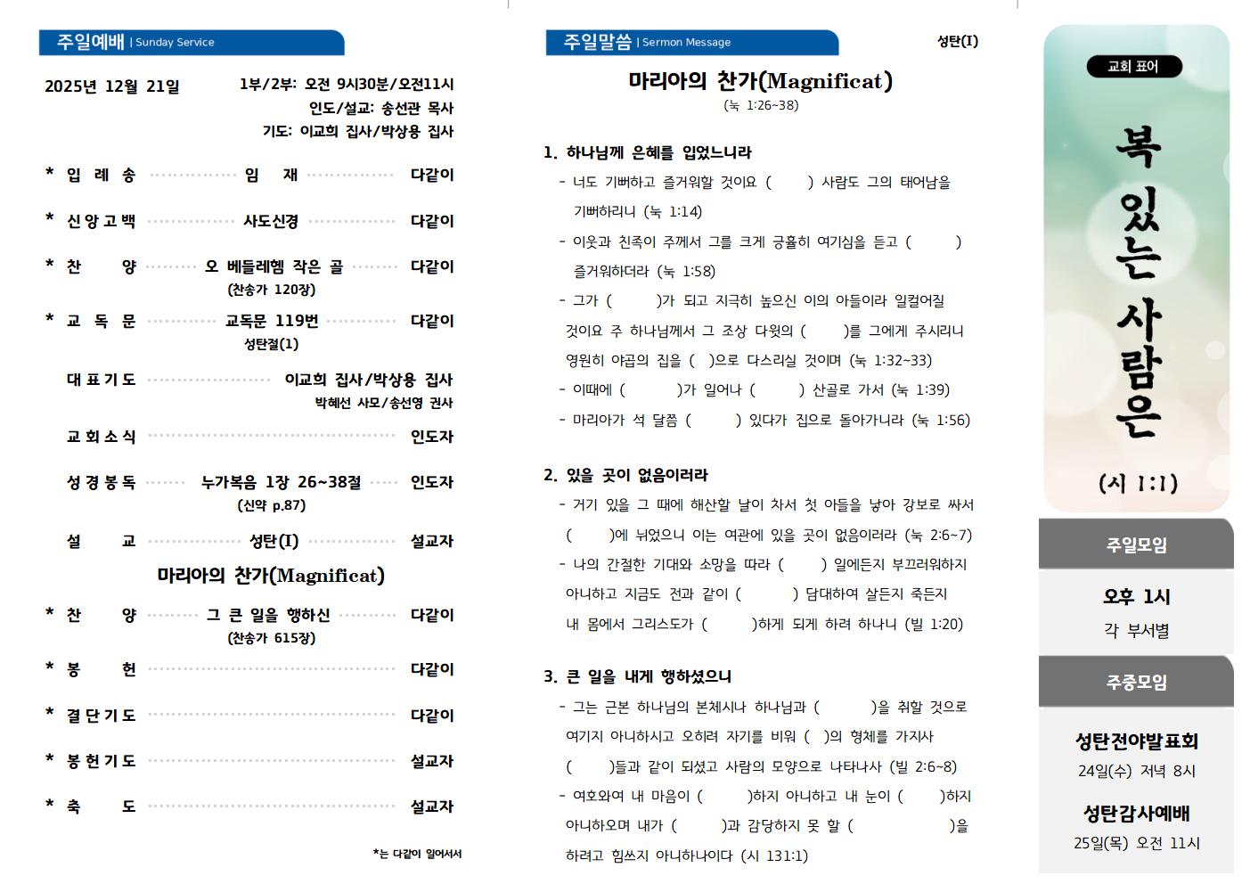 2025년 12월 21일 주일예배 admin2025-12-20T14:38:11+09:00공유해주세요!FacebookTwitterGoogle+ Related Posts 2026년 2월 1일 주일예배 2026년 2월 1일 주일예배 2026-01-31 | 0 Comments 2026년 1월 25일 주일예배 2026년 1월 25일 주일예배 2026-01-24 | 0 Comments 2026년 1월 18일 주일예배 2026년 1월 18일 주일예배 2026-01-17 | 0 Comments 2026년 1월 11일 주일예배 2026년 1월 11일 주일예배 2026-01-10 | 0 Comments 2026년 1월 4일 주일예배 2026년 1월 4일 주일예배 2026-01-03 | 0 Comments